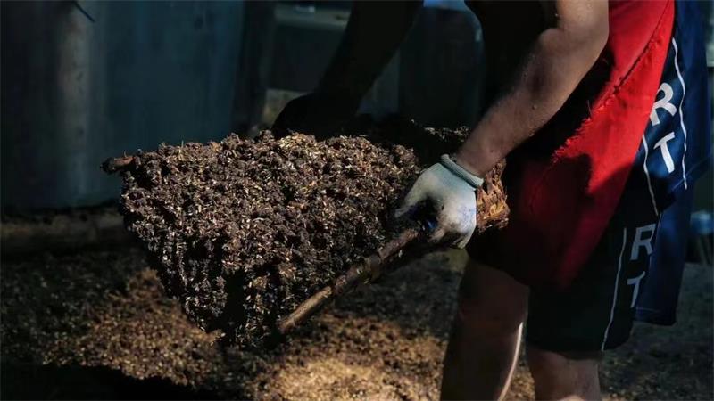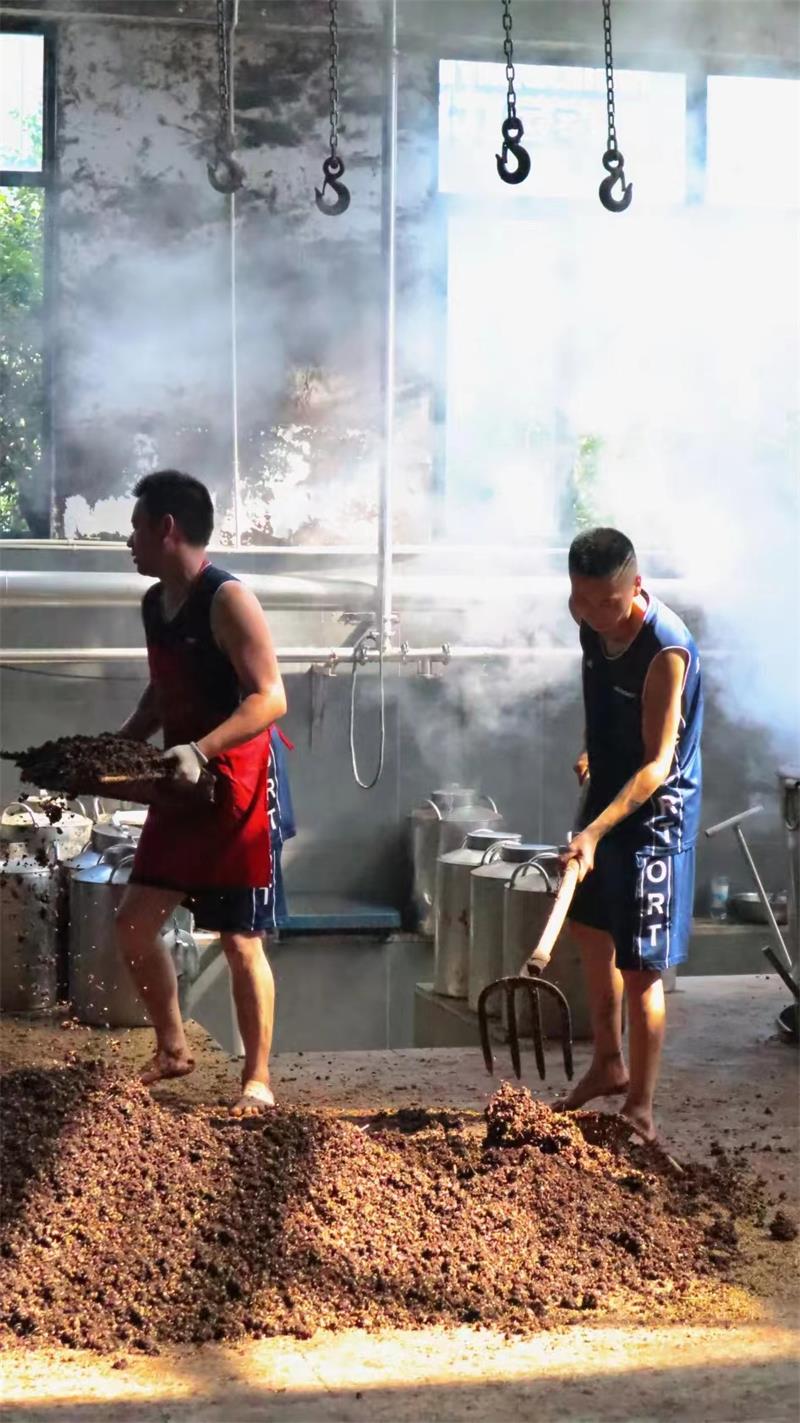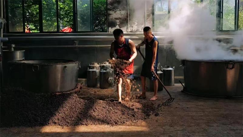 工廠,釀酒工人們正將發(fā)酵后的紅高粱放