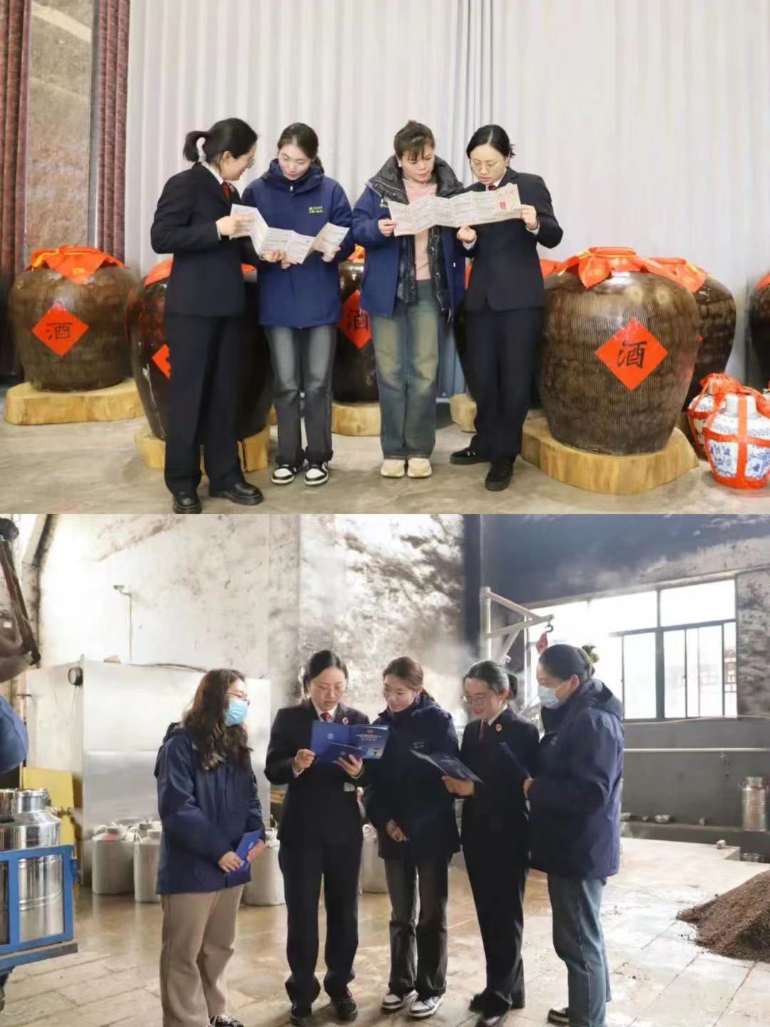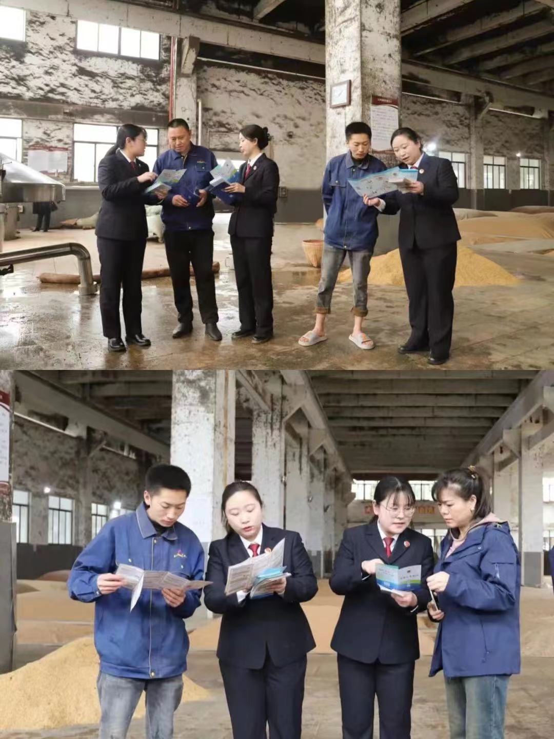 法律服務(wù)團(tuán)一行來到玉祁酒業(yè)車間,與生產(chǎn)一線的工人師傅親切交流,她們觀看釀酒師傅現(xiàn)場展示白酒釀制技藝,了解生產(chǎn)經(jīng)營情況,向公司相關(guān)管理人員宣傳刑事、民事、行政、公益訴訟等檢察職能,普及《民法典》等法律法規(guī),為企業(yè)發(fā)展提供法治保障。